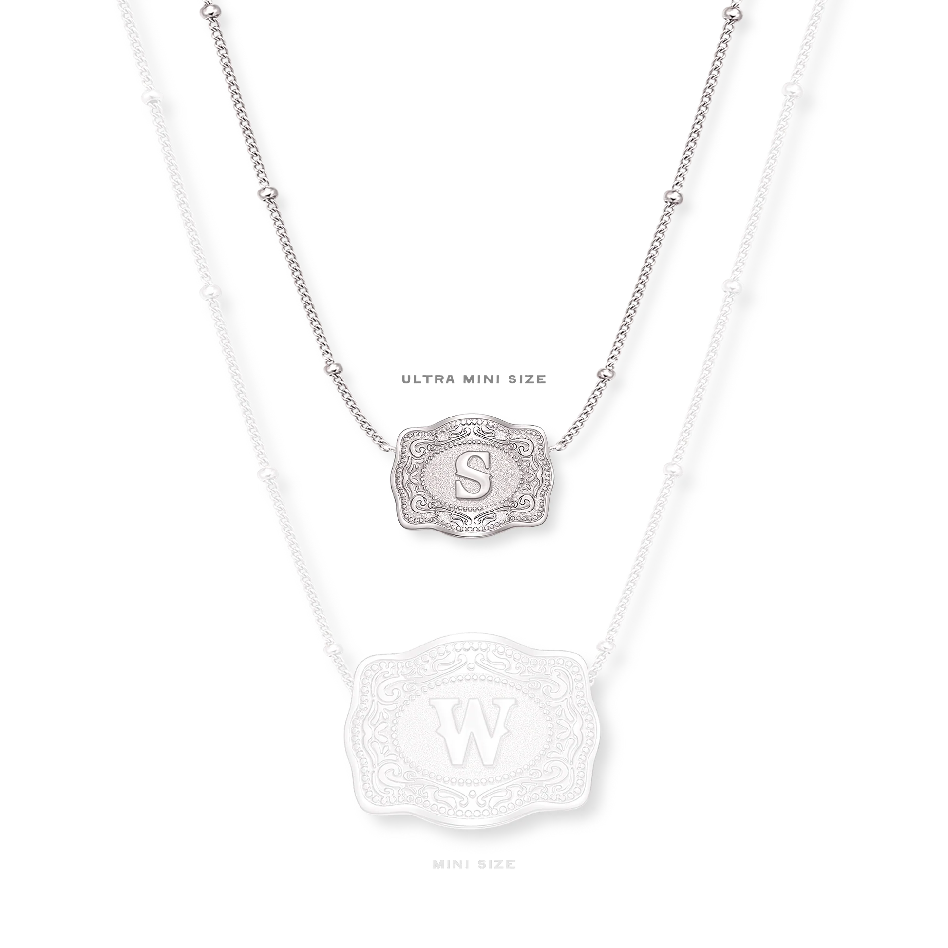 SPURWEST ULTRA-MINI SILVER INITIAL BELT BUCKLE NECKLACE - BEADED CHAIN